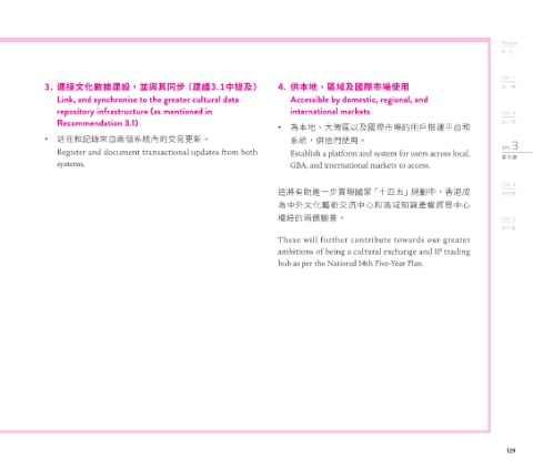 3. 連接文化數據建設,並與其同步(建議3.1中提及) 4. 供本地、區域及國際市場使用 第一章