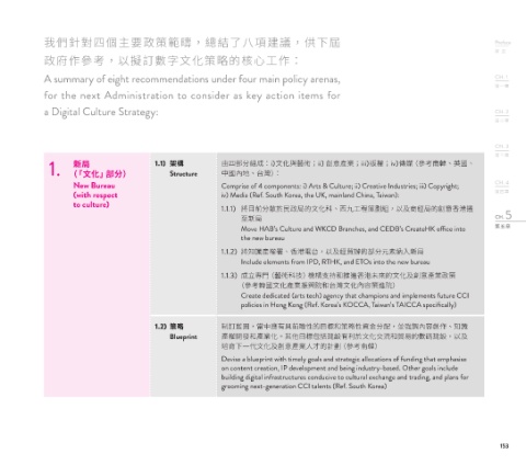 1. (「文化」部分) 1.1) 架構 由四部分組成:i)文化與藝術;ii) 創意產業;iii)版權;iv)傳媒(參考南韓、英國、 第三章