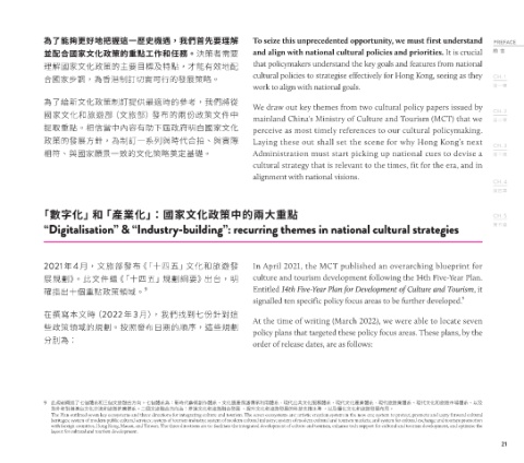 相符、與國家願景一致的文化策略奠定基礎。 Administration must start picking up national cues to devise a 第三章