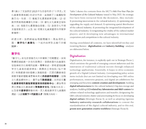 表 1 展示了文旅部於 2021 年 5 月發布的《「十四五」文 Table 1 shows the contents from the MCT’s 14th Five-Year Plan for