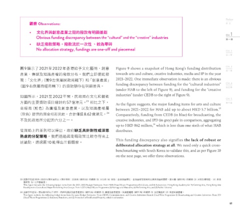 圖9 顯示了 2021 至2022 年香港給予文化藝術、創意 Figure 9 shows a snapshot of Hong Kong’s funding distribution CH. 3
