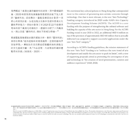 港元,其中988萬港元授予藝術科技類別。在三個成功獲批的藝術科技項目中,一項涉及傳統文化元素,旨在將武術與新媒體技術結合。另外兩個獲資助項目主要聚焦科技於現代藝術的應用,較少涉及傳統