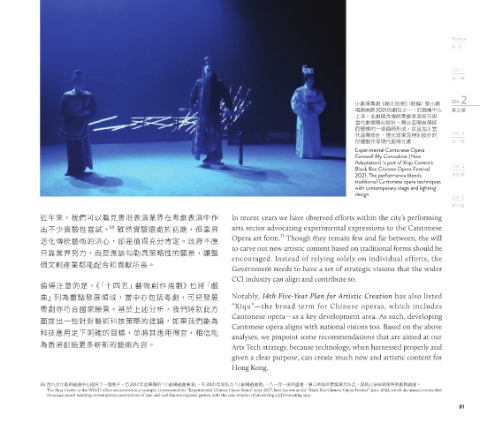 33 西九文化區的戲曲中心提供了一個例子。自2017年起舉辦的「小劇場戲曲展演」,在2021年易名為「小劇場戲曲節」,乃一年一度的盛會,展示地區的獲獎當代作品,其核心使命是保育和創新戲曲。
