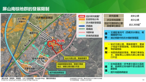 14屏山南棕地群的發展限制屏山南鍾屋村站泥圍棕地群洪水橋站(規劃中)研究面積 約8公頃涉及棕地面積 約3公頃估計可提供的公營房屋單位數目 約3,300個#優勢• 交通配套尚可 (西鐵洪水橋站、輕鐵鍾屋村站)• 接近規劃中的洪水橋新發展區• 貼近元朗公路,需後移樓宇,會縮少地盆可發展面積。另需採取隔音等舒緩措施• 地區路網建設落後,單線行車線為主,接駁青山公路和元朗公路交匯口不足限制• 從地區層面一併考慮交通及社區配套,協調附近棕地群作更全面的規劃發展• 提升地區路網建設建議R(D)CDAGB估計研究範圍*目前棕地分佈西鐵綫輕鐵綫9號幹線深港西部通道資料來源:發展局,規劃署,土木工程拓展署,Google Map,團結香港基金地區路網建設落後,單線行車線為主,接駁公路交匯口不足貼近元朗公路,需後移樓宇提升地區路網建設*根據規劃署公佈的位置,團結香港基金估計有關棕地的範圍#參考規劃署建議,以地積比3.6倍作基礎洪水橋新發展區洪水橋新發展區14藍地北棕地群