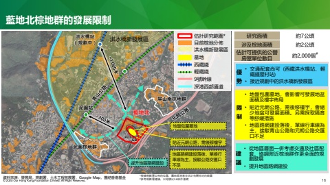 藍地北棕地群的發展限制洪水橋站(規劃中)泥圍棕地群屏山南棕地群泥圍站研究面積 約7公頃涉及棕地面積 約2公頃估計可提供的公營房屋單位數目 約2,000個#優勢• 交通配套尚可 (西鐵洪水橋站、輕鐵鍾屋村站)• 接近規劃中的洪水橋新發展區• 地盤包圍墓地,會影響可發展地盆面積及樓宇佈局• 貼近元朗公路,需後移樓宇,會縮少地盆可發展面積。另需採取隔音等舒緩措施• 地區路網建設落後,單線行車線為主,接駁青山公路和元朗公路交匯口不足限制• 從地區層面一併考慮交通及社區配套,協調附近棕地群作更全面的規劃發展• 提升地區路網建設建議R(D)GB資料來源:發展局,規劃署,土木工程拓展署,Google Map,團結香港基金地區路網建設落後,單線行車線為主,接駁公路交匯口不足地盤包圍墓地估計研究範圍*目前棕地分佈西鐵綫輕鐵綫9號幹線深港西部通道洪水橋新發展區墓地*根據規劃署公佈的位置,團結香港基金估計有關棕地的範圍#參考規劃署建議,以地積比3.6倍作基礎提升地區路網建設洪水橋新發展區貼近元朗公路,需後移樓宇藍地北16