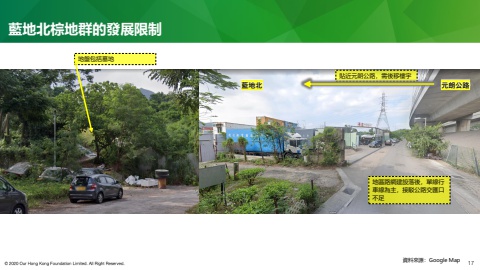 藍地北棕地群的發展限制元朗公路地區路網建設落後,單線行車線為主,接駁公路交匯口不足地盤包括墓地貼近元朗公路,需後移樓宇藍地北17 資料來源:Google Map