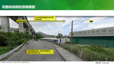 泥圍棕地群的發展限制地區路網建設落後,單線行車線為主,接駁公路交匯口不足貼近深港西部通道和元朗公路,需後移樓宇深港西部通道 泥圍資料來源:Google Map 19