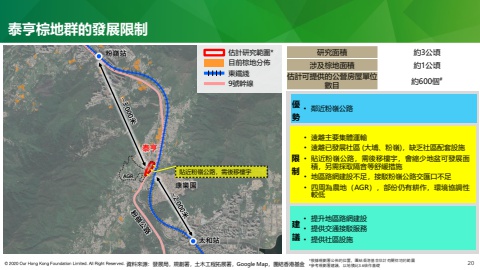 泰亨棕地群的發展限制泰亨康樂園研究面積 約3公頃涉及棕地面積 約1公頃估計可提供的公營房屋單位數目 約600個#優勢• 鄰近粉嶺公路• 遠離主要集體運輸• 遠離已發展社區 (大埔、粉嶺),缺乏社區配套設施• 貼近粉嶺公路,需後移樓宇,會縮少地盆可發展面積,另需採取隔音等舒緩措施• 地區路網建設不足,接駁粉嶺公路交匯口不足• 四周為農地(AGR),部份仍有耕作,環境協調性較低限制• 提升地區路網建設• 提供交通接駁服務• 提供社區設施建議AGR貼近粉嶺公路,需後移樓宇資料來源:發展局,規劃署,土木工程拓展署,Google Map,團結香港基金 *根據規劃署公佈的位置,團結香港基金估計有關棕地的範圍#參考規劃署建議,以地積比3.6倍作基礎估計研究範圍*目前棕地分佈東鐵綫9號幹線太和站粉嶺站20