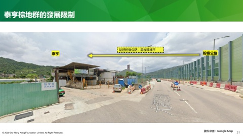 泰亨棕地群的發展限制貼近粉嶺公路,需後移樓宇21泰亨 粉嶺公路資料來源:Google Map