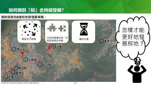 如何做到「棕」合持續發展?23現時採取的8塊棕地群發展策略:怎樣才能更好地發展棕地?零散並小面積 欠缺與週邊地區一併相容發展的考慮 費時失事1 屏山北7 泥圍6 藍地北8 泰亨4 沙埔5 屏山南2 大旗嶺3 十八鄉