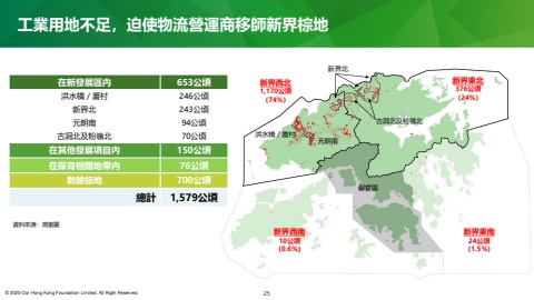 新界西北1,170公頃(74%)新界東北376公頃(24%)新界西南10公頃(0.6%)新界東南24公頃(1.5%)都會區洪水橋/厦村元朗南新界北古洞北及粉嶺北工業用地不足,迫使物流營運商移師新界棕地25在新發展區內 653公頃洪水橋/厦村 246公頃新界北 243公頃元朗南 94公頃古洞北及粉嶺北 70公頃在其他發展項目內 150公頃在保育相關地帶內 76公頃剩餘棕地 700公頃總計 1,579公頃資料來源:規劃署