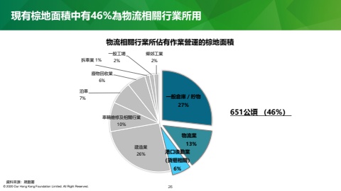 現有棕地面積中有46%為物流相關行業所用26資料來源:規劃署一般倉庫/貯物27%物流業13%港口後勤業(貨櫃相關)6%建造業26%車輛維修及相關行業10%泊車7%廢物回收業6%拆車業 1%一般工場2%鄉郊工業2%物流相關行業所佔有作業營運的棕地面積651公頃 (46%)