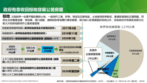 棕地 泛指新界一些遭平整的農耕土地,一般用作工業、貯物、物流及泊車用途,土地使用效率較低,會導致環境和交通問題,同時也支持著建造業、物流業、港口後勤、廢物回收等相關行業的發展,除已納入新發展區的棕地以外,目前政府亦有意收回部分比較大片的棕地群用作公營房屋發展規劃署委聘顧問開展<新界棕地使用及作業現況研究> 2017年4月規劃署發布<新界棕地使用及作業現況研究> 2019年11月土木工程拓展署展開<物色棕地群作公營房屋發展 (首階段)>的工程可行性研究 2020年第二季2020年第四季預計規劃署完成<物色棕地群作公營房屋發展(第二階段)>研究 (290公頃)預計土木工程拓展署完成首階段工程可行性研究政府有意收回棕地發展公營房屋已落實房屋發展803公頃保育範圍內76公頃高發展潛力(160公頃)合適作公營房屋發展(36公頃 )低發展潛力250公頃新界棕地總面積: 1,579公頃資料來源:《新界棕地使用及作業現況研究可行性研究》(2019),《立法會CB(1)160/19-20(07)號文件》 (2019)8個棕地群63公頃相鄰土地27公頃估計提供超過20,000個單位(以3.6倍地積比率計算)首階段(合適棕地)36公頃規劃署發布<物色棕地群作公營房屋發展 (首階段)>結果 2020年3月中發展潛力290公頃