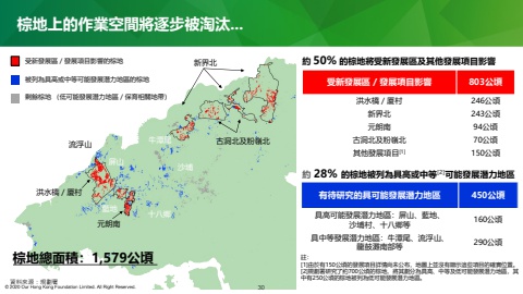 30棕地上的作業空間將逐步被淘汰...資料來源:規劃署棕地總面積:1,579公頃約 50% 的棕地將受新發展區及其他發展項目影響受新發展區 / 發展項目影響 803公頃洪水橋 / 厦村 246公頃新界北 243公頃元朗南 94公頃古洞北及粉嶺北 70公頃其他發展項目[1] 150公頃有待研究的具可能發展潛力地區 450公頃具高可能發展潛力地區:屏山、藍地、沙埔村、十八鄉等 160公頃具中等發展潛力地區:牛潭尾、流浮山、龍鼓灘南部等 290公頃約 28% 的棕地被列為具高或中等[2]可能發展潛力地區新界北古洞北及粉嶺北洪水橋/厦村元朗南藍地屏山 沙埔流浮山 牛潭尾十八鄉受新發展區 / 發展項目影響的棕地被列為具高或中等可能發展潛力地區的棕地剩餘棕地 (低可能發展潛力地區 / 保育相關地帶)註:[1]由於有150公頃的發展項目詳情尚未公布,地圖上並沒有顯示這些項目的確實位置。[2]規劃署研究了約700公頃的棕地,將其劃分為具高、中等及低可能發展潛力地區,其中有250公頃的棕地被列為低可能發展潛力地區。