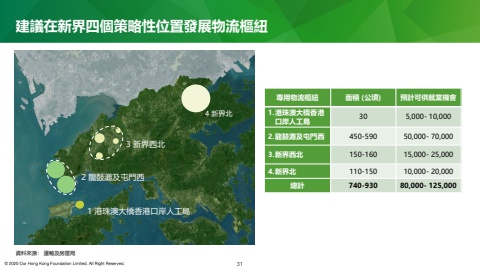 建議在新界四個策略性位置發展物流樞紐3 新界西北1 港珠澳大橋香港口岸人工島2 龍鼓灘及屯門西4 新界北專用物流樞紐 面積 (公頃) 預計可供就業機會1.港珠澳大橋香港口岸人工島 30 5,000- 10,0002.龍鼓灘及屯門西 450-590 50,000- 70,0003.新界西北 150-160 15,000- 25,0004.新界北 110-150 10,000- 20,000 總計 740-930 80,000- 125,000資料來源: 運輸及房屋局31