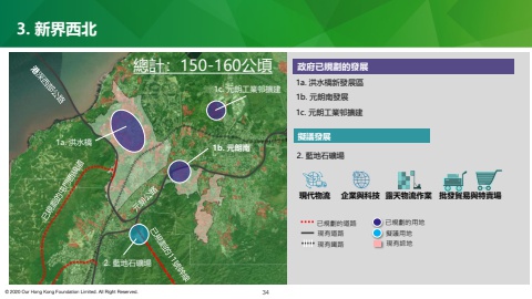 1a. 洪水橋3. 新界西北34已規劃的道路擬議發展1b. 元朗南2. 藍地石礦場總計:150-160公頃現有道路現代物流 企業與科技 露天物流作業 批發貿易與特賣場已規劃的用地擬議用地現有綜地政府已規劃的發展1a. 洪水橋新發展區1b. 元朗南發展1c. 元朗工業邨擴建2. 藍地石礦場1c. 元朗工業邨擴建現有鐵路