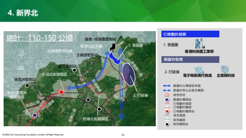 354. 新界北2. 打鼓嶺已規劃的發展擬議的發展電子商貿現代物流 企業與科技香港科技園工業邨現有棕地現有鐵路站現有道路現有鐵路已規劃的鐵路站已規劃的道路已規劃的鐵路建議的鐵路站建議的北環綫延伸綫建議的南北走廊及鐵路1. 香園圍2. 打鼓嶺1. 香園圍新田站羅湖管制站文錦渡管制站蓮塘 /香園圍管制站落馬洲管制站新田/落馬洲發展樞紐總計:110-150 公頃古洞北新發展區粉嶺北新發展區文錦渡物流走廊新界北新市鎮2. 打鼓嶺·