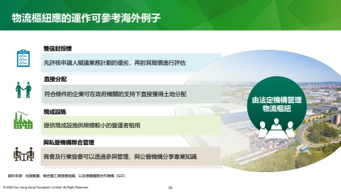 物流樞紐應的運作可參考海外例子先評核申請人擬議業務計劃的優劣,再對其報價進行評估雙信封投標直接分配現成設施資料來源:裕廊集團、聯合國工業發展組織,以及德國國際合作機構(GIZ)與私營機構聯合管理符合條件的企業可在政府機關的支持下直接獲得土地分配提供現成設施供規模較小的營運者租用商會及行業協會可以透過參與管理,與公營機構分享專業知識36由法定機構管理物流樞紐