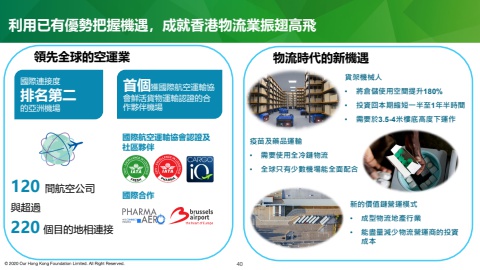 利用已有優勢把握機遇,成就香港物流業振翅高飛40120 間航空公司與超過220 個目的地相連接國際連接度排名第二的亞洲機場首個獲國際航空運輸協會鮮活貨物運輸認證的合作夥伴機場國際航空運輸協會認證及社區夥伴國際合作領先全球的空運業 物流時代的新機遇貨架機械人• 將倉儲使用空間提升180%• 投資回本期縮短一半至1年半時間• 需要於3.5-4米樓底高度下運作疫苗及藥品運輸• 需要使用全冷鏈物流• 全球只有少數機場能全面配合新的價值鏈營運模式• 成型物流地產行業• 能盡量減少物流營運商的投資成本