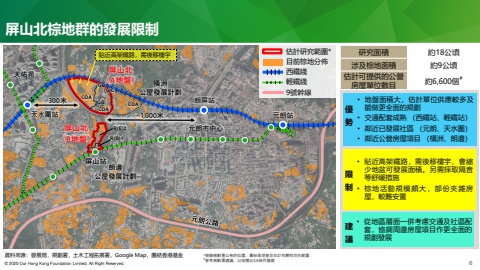 CDA 天水圍站朗屏站天佑苑橫洲公屋發展計劃元朗市中心屏山站 朗邊公屋發展計劃屏山北(A地盤)屏山北(B地盤)~300米~1,000米研究面積 約18公頃涉及棕地面積 約9公頃估計可提供的公營房屋單位數目 約6,600個#CDACDAGBGIC估計研究範圍*目前棕地分佈西鐵綫輕鐵綫屏山北棕地群的發展限制優勢• 地盤面積大,估計單位供應較多及能做更全面的規劃• 交通配套成熟 (西鐵站、輕鐵站)• 鄰近已發展社區 (元朗、天水圍)• 鄰近公營房屋項目 (橫洲、朗邊)限制• 貼近高架鐵路,需後移樓宇,會縮少地盆可發展面積。另需採取隔音等舒緩措施• 棕地活動規模頗大,部份夾雜房屋,較難安置建議• 從地區層面一併考慮交通及社區配套,協調周邊房屋項目作更全面的規劃發展元朗站9號幹線資料來源:發展局,規劃署,土木工程拓展署,Google Map,團結香港基金貼近高架鐵路,需後移樓宇*根據規劃署公佈的位置,團結香港基金估計有關棕地的範圍#參考規劃署建議,以地積比3.6倍作基礎 6R(E)2R(B)1GB