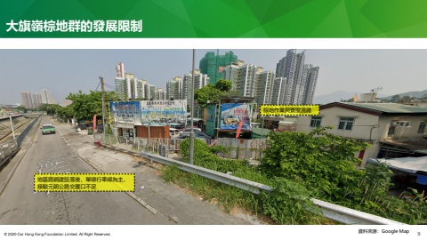 大旗嶺棕地群的發展限制地區路網建設落後,單線行車線為主,接駁元朗公路交匯口不足9棕地作業與寮屋混雜資料來源:Google Map