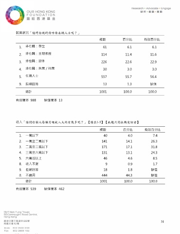 收入「請問你個人每個月嘅收入大約有幾多呢?」【讀出1-5】【此題只問在職受訪者】