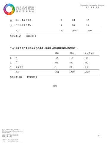 19. 其他:講座/論壇 1 0.1 1.9 20. 其他:展覽/街站 3 0.3 5.7 總計 57 100.0 100.0 有效樣本 57 缺值樣本 0 Q10「你屋企有冇家人因年紀大或疾病,而需要人特別照顧佢嘅生活起居呢?」 頻數 百分比 有效百分比 1. 有 117 11.7 11.7 2. 冇 882 88.1 88.3 9. 拒絕回答 2 0.2 缺值 總計 1001 100.0 100.0 有效樣本 999 缺值樣本 2 [完] 42