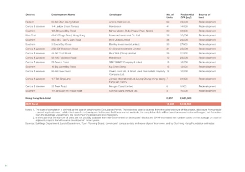 Notes: 1. The date of completion is defined as the date of obtaining the Occupation Permit. The expected date is sourced from the sales brochure of the project, disclosure from presale
