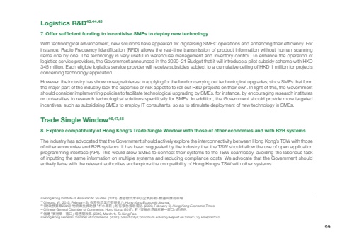 Logistics R&D43,44,45With technological advancement, new solutions have appeared for digitalising SMEs’ operations and enhancing their efficiency. For instance, Radio Frequency Identification (RFID) allows the real-time transmission of product information without human scanning items one by one. The technology is very useful in warehouse management and inventory control. To enhance the operation of logistics service providers, the Government announced in the 2020–21 Budget that it will introduce a pilot subsidy scheme with HKD 345 million. Each eligible logistics service provider will receive subsidies subject to a cumulative ceiling of HKD 1 million for projects concerning technology application. However, the industry has shown meagre interest in applying for the fund or carrying out technological upgrades, since SMEs that form the major part of the industry lack the expertise or risk appetite to roll out R&D projects on their own. In light of this, the Government should consider implementing policies to facilitate technological upgrading by SMEs, for instance, by encouraging research institutes or universities to research technological solutions specifically for SMEs. In addition, the Government should provide more targeted incentives, such as subsidising SMEs to employ IT consultants, so as to stimulate deployment of new technology in SMEs.7. Offer sufficient funding to incentivise SMEs to deploy new technology 43 Hong Kong Institute of Asia-Pacific Studies. (2013). 香港物流業中小企業挑戰、機遇與應對策略. 44 Cheung. W. (2015, February 5). 香港物流業仍有競爭力. Hong Kong Economic Journal. 45 《財政預算案2020》物流業批資助額「杯水車薪 」盼有緊急援助補貼. (2020, February 6). Hong Kong Economic Times. 46 Chinese General Chamber of Commerce, Hong Kong. (2017). 對「發展香港貿易單一窗口」的意見. 47 倡建「貿易單一窗口」增通關效率. (2019, March 1). Ta Kung Pao. 48 Hong Kong General Chamber of Commerce. (2020). Smart City Consortium Advisory Report on Smart City Blueprint 2.0.Trade Single Window46,47,48The industry has advocated that the Government should actively explore the interconnectivity between Hong Kong’s TSW with those of other economies and B2B systems. It has been suggested by the industry that the TSW should allow the use of open application programming interface (API). This would allow SMEs to connect their systems to the TSW seamlessly, avoiding the laborious task of inputting the same information on multiple systems and reducing compliance costs. We advocate that the Government should actively liaise with the relevant authorities and explore the compatibility of Hong Kong’s TSW with other systems.8. Explore compatibility of Hong Kong’s Trade Single Window with those of other economies and with B2B systems99