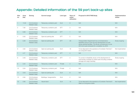 Site no.Area (ha)Zoning Current usage Lots type Years of underutilisationProposal in 2015 THB Study Implementation status1 11.00 OU (Container Related Uses)Temporary container yard GLA 9 N/A N/A 2 7.39 OU (Container Related Uses)Temporary container yard STT 3 N/A N/A 3 6.68 OU (Container Related Uses)Temporary container yard STT 1 N/A N/A 4 5.83 OU (Container Related Uses)Open air parking site STT 5 N/A N/A 5 5.26 OU (Container Related Uses)Open air parking site STT 20 Transportation Department has commissioned a feasibility study to look into the development of multistorey parking facilities. The Study commenced in June 2014 and was scheduled for completion by 2015Study ongoing6 4.94 OU (Container Related Uses)Open air parking site GLA 19 To be disposed to the operators of Container Terminal 7 on a long-term basisNot implemented7 4.17 OU (Container Related Uses)Temporary container yard STT 4 N/A N/A 8 3.48 OU (Container Related Uses)Temporary container yard STT 4 To conduct a feasibility study on the development of multi-storey complex for mixed uses including container storage and cargo handlingStudy ongoing9 3.34 OU (Container Related Uses)Temporary container yard Private 4 N/A N/A 10 3.34 OU (Container Related Uses)Temporary container yard Private 4 N/A N/A 11 3.00 OU (Container Related Uses)Open air parking site GLA 9 N/A N/A 12 2.94 OU (Container Related Uses)Buildings / barge berths GLA 2 N/A N/A 13 2.90 OU (Container Related Uses)Vacant land GLA 13 To be disposed to the operators of Container Terminal 8 West on a long-term basisNot implementedAppendix: Detailed information of the 59 port back-up sites101