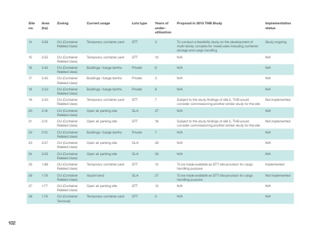 14 2.56 OU (Container Related Uses)Temporary container yard STT 3 To conduct a feasibility study on the development of multi-storey complex for mixed uses including container storage and cargo handlingStudy ongoing15 2.55 OU (Container Related Uses)Temporary container yard STT 10 N/A N/A 16 2.40 OU (Container Related Uses)Buildings / barge berths Private 6 N/A N/A 17 2.40 OU (Container Related Uses)Buildings / barge berths Private 3 N/A N/A 18 2.33 OU (Container Related Uses)Buildings / barge berths Private 8 N/A N/A 19 2.30 OU (Container Related Uses)Temporary container yard STT 7 Subject to the study findings of site 5, THB would consider commissioning another similar study for the siteNot implemented20 2.18 OU (Container Related Uses)Open air parking site GLA 27 N/A N/A 21 2.12 OU (Container Related Uses)Open air parking site STT 18 Subject to the study findings of site 5, THB would consider commissioning another similar study for the siteNot implemented22 2.10 OU (Container Related Uses)Buildings / barge berths Private 7 N/A N/A 23 2.07 OU (Container Related Uses)Open air parking site GLA 30 N/A N/A 24 2.05 OU (Container Related Uses)Open air parking site GLA 30 N/A N/A 25 1.88 OU (Container Related Uses)Temporary container yard STT 12 To be made available as STT site provision for cargo handling purposeImplemented26 1.78 OU (Container Related Uses)Vacant land GLA 27 To be made available as STT site provision for cargo handling purposeNot implemented27 1.77 OU (Container Related Uses)Open air parking site STT 13 N/A N/A 28 1.76 OU (Container Terminal)Temporary container yard STT 0 N/A N/A Site no.Area (ha)Zoning Current usage Lots type Years of underutilisationProposal in 2015 THB Study Implementation status102
