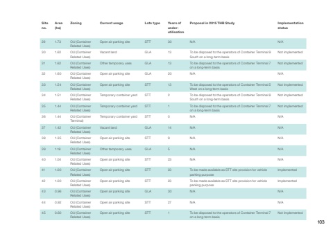 29 1.73 OU (Container Related Uses)Open air parking site STT 30 N/A N/A 30 1.62 OU (Container Related Uses)Vacant land GLA 13 To be disposed to the operators of Container Terminal 9 South on a long-term basisNot implemented31 1.62 OU (Container Related Uses)Other temporary uses GLA 13 To be disposed to the operators of Container Terminal 7 on a long-term basisNot implemented32 1.60 OU (Container Related Uses)Open air parking site GLA 20 N/A N/A 33 1.54 OU (Container Related Uses)Open air parking site STT 13 To be disposed to the operators of Container Terminal 5 West on a long-term basisNot implemented34 1.51 OU (Container Related Uses)Temporary container yard STT 2 To be disposed to the operators of Container Terminal 8 South on a long-term basisNot implemented35 1.44 OU (Container Related Uses)Temporary container yard STT 1 To be disposed to the operators of Container Terminal 7 on a long-term basisNot implemented36 1.44 OU (Container Terminal)Temporary container yard STT 0 N/A N/A 37 1.42 OU (Container Related Uses)Vacant land GLA 14 N/A N/A 38 1.35 OU (Container Related Uses)Open air parking site STT 9 N/A N/A 39 1.18 OU (Container Related Uses)Other temporary uses GLA 5 N/A N/A 40 1.04 OU (Container Related Uses)Open air parking site STT 23 N/A N/A 41 1.00 OU (Container Related Uses)Open air parking site STT 23 To be made available as STT site provision for vehicle parking purposeImplemented42 1.00 OU (Container Related Uses)Open air parking site STT 23 To be made available as STT site provision for vehicle parking purposeImplemented43 0.96 OU (Container Related Uses)Open air parking site GLA 30 N/A N/A 44 0.92 OU (Container Related Uses)Open air parking site STT 27 N/A N/A 45 0.60 OU (Container Related Uses)Open air parking site STT 1 To be disposed to the operators of Container Terminal 7 on a long-term basisNot implementedSite no.Area (ha)Zoning Current usage Lots type Years of underutilisationProposal in 2015 THB Study Implementation status103