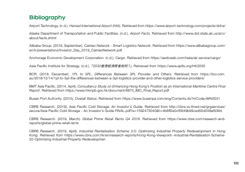 BibliographyAirport Technology. (n.d.). Hamad International Airport (HIA). Retrieved from https://www.airport-technology.com/projects/doha/Alaska Department of Transportation and Public Facilities. (n.d.). Airport Facts. Retrieved from http://www.dot.state.ak.us/anc/about/facts.shtmlAlibaba Group. (2019, September). Cainiao Network - Smart Logistics Network. Retrieved from https://www.alibabagroup.com/en/ir/presentations/Investor_Day_2019_CainiaoNetwork.pdfAnchorage Economic Development Corporation. (n.d.). Cargo. Retrieved from https://aedcweb.com/tsaia/air-service/cargo/Asia Pacifi c Institute for Strategy. (n.d.). 「2030香港經濟將會如何?」. Retrieved from https://www.apifs.org/HK2030BCR. (2018, December). 1PL to 5PL: Differences Between 3PL Provider and Others. Retrieved from https://bcr.com.au/2018/12/14/1pl-to-5pl-the-differences-between-a-3pl-logistics-provider-and-other-logistics-service-providers/ BMT Asia Pacifi c. (2014, April). Consultancy Study on Enhancing Hong Kong’s Position as an International Maritime Centre Final Report. Retrieved from https://www.hkmpb.gov.hk/document/8870_IMC_Final_Report.pdfBusan Port Authority. (2015). Overall Status. Retrieved from https://www.busanpa.com/eng/Contents.do?mCode=MN0031CBRE Research. (2019). Asia Pacifi c Cold Storage: An Investor's Guide. Retrieved from http://cbre.vo.llnwd.net/grgservices/secure/Asia Pacifi c Cold Storage - An Investor's Guide FINAL.pdf?e=1592473040&h=4b6ff2e0cf5649b99ced55d048af939d CBRE Research. (2019, March). Global Prime Retail Rents Q4 2018. Retrieved from https://www.cbre.com/research-andreports/global-prime-retail-rentsCBRE Research. (2019, April). Industrial Revitalisation Scheme 2.0: Optimising Industrial Property Redevelopment in Hong Kong. Retrieved from https://www.cbre.com.hk/en/research-reports/Hong-Kong-Viewpoint--Industrial-Revitalisation-Scheme20-Optimising-Industrial-Property-Redevelopmen105