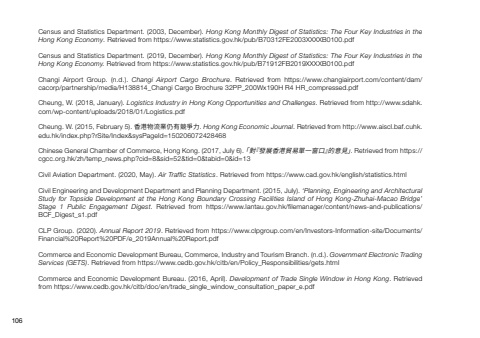 Census and Statistics Department. (2003, December). Hong Kong Monthly Digest of Statistics: The Four Key Industries in the Hong Kong Economy. Retrieved from https://www.statistics.gov.hk/pub/B70312FE2003XXXXB0100.pdfCensus and Statistics Department. (2019, December). Hong Kong Monthly Digest of Statistics: The Four Key Industries in the Hong Kong Economy. Retrieved from https://www.statistics.gov.hk/pub/B71912FB2019XXXXB0100.pdfChangi Airport Group. (n.d.). Changi Airport Cargo Brochure. Retrieved from https://www.changiairport.com/content/dam/cacorp/partnership/media/H138814_Changi Cargo Brochure 32PP_200Wx190H R4 HR_compressed.pdf Cheung, W. (2018, January). Logistics Industry in Hong Kong Opportunities and Challenges. Retrieved from http://www.sdahk.com/wp-content/uploads/2018/01/Logistics.pdfCheung. W. (2015, February 5). 香港物流業仍有競爭力. Hong Kong Economic Journal. Retrieved from http://www.aiscl.baf.cuhk.edu.hk/index.php?rSite/Index&sysPageId=150206072428468Chinese General Chamber of Commerce, Hong Kong. (2017, July 6). 「對『發展香港貿易單一窗口』的意見」. Retrieved from https://cgcc.org.hk/zh/temp_news.php?cid=8&sid=52&tid=0&tabid=0&id=13Civil Aviation Department. (2020, May). Air Traffi c Statistics. Retrieved from https://www.cad.gov.hk/english/statistics.htmlCivil Engineering and Development Department and Planning Department. (2015, July). ‘Planning, Engineering and Architectural Study for Topside Development at the Hong Kong Boundary Crossing Facilities Island of Hong Kong-Zhuhai-Macao Bridge’ Stage 1 Public Engagement Digest. Retrieved from https://www.lantau.gov.hk/fi lemanager/content/news-and-publications/BCF_Digest_s1.pdfCLP Group. (2020). Annual Report 2019. Retrieved from https://www.clpgroup.com/en/Investors-Information-site/Documents/Financial Report PDF/e_2019Annual Report.pdfCommerce and Economic Development Bureau, Commerce, Industry and Tourism Branch. (n.d.). Government Electronic Trading Services (GETS). Retrieved from https://www.cedb.gov.hk/citb/en/Policy_Responsibilities/gets.htmlCommerce and Economic Development Bureau. (2016, April). Development of Trade Single Window in Hong Kong. Retrieved from https://www.cedb.gov.hk/citb/doc/en/trade_single_window_consultation_paper_e.pdf106