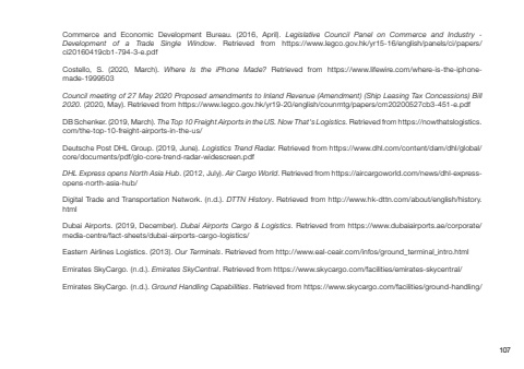 Commerce and Economic Development Bureau. (2016, April). Legislative Council Panel on Commerce and Industry - Development of a Trade Single Window. Retrieved from https://www.legco.gov.hk/yr15-16/english/panels/ci/papers/ci20160419cb1-794-3-e.pdfCostello, S. (2020, March). Where Is the iPhone Made? Retrieved from https://www.lifewire.com/where-is-the-iphonemade-1999503Council meeting of 27 May 2020 Proposed amendments to Inland Revenue (Amendment) (Ship Leasing Tax Concessions) Bill 2020. (2020, May). Retrieved from https://www.legco.gov.hk/yr19-20/english/counmtg/papers/cm20200527cb3-451-e.pdfDB Schenker. (2019, March). The Top 10 Freight Airports in the US. Now That's Logistics. Retrieved from https://nowthatslogistics.com/the-top-10-freight-airports-in-the-us/Deutsche Post DHL Group. (2019, June). Logistics Trend Radar. Retrieved from https://www.dhl.com/content/dam/dhl/global/core/documents/pdf/glo-core-trend-radar-widescreen.pdfDHL Express opens North Asia Hub. (2012, July). Air Cargo World. Retrieved from https://aircargoworld.com/news/dhl-expressopens-north-asia-hub/Digital Trade and Transportation Network. (n.d.). DTTN History. Retrieved from http://www.hk-dttn.com/about/english/history.htmlDubai Airports. (2019, December). Dubai Airports Cargo & Logistics. Retrieved from https://www.dubaiairports.ae/corporate/media-centre/fact-sheets/dubai-airports-cargo-logistics/Eastern Airlines Logistics. (2013). Our Terminals. Retrieved from http://www.eal-ceair.com/infos/ground_terminal_intro.htmlEmirates SkyCargo. (n.d.). Emirates SkyCentral. Retrieved from https://www.skycargo.com/facilities/emirates-skycentral/Emirates SkyCargo. (n.d.). Ground Handling Capabilities. Retrieved from https://www.skycargo.com/facilities/ground-handling/107