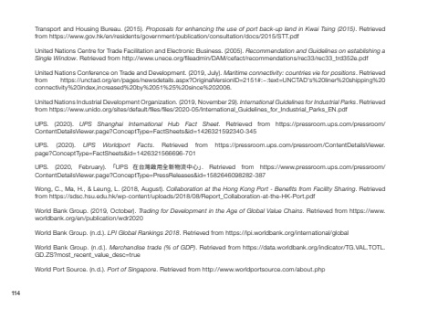 Transport and Housing Bureau. (2015). Proposals for enhancing the use of port back-up land in Kwai Tsing (2015). Retrieved from https://www.gov.hk/en/residents/government/publication/consultation/docs/2015/STT.pdfUnited Nations Centre for Trade Facilitation and Electronic Business. (2005). Recommendation and Guidelines on establishing a Single Window. Retrieved from http://www.unece.org/fi leadmin/DAM/cefact/recommendations/rec33/rec33_trd352e.pdfUnited Nations Conference on Trade and Development. (2019, July). Maritime connectivity: countries vie for positions. Retrieved from https://unctad.org/en/pages/newsdetails.aspx?OriginalVersionID=2151#:~:text=UNCTAD's liner shipping connectivity index,increased by 51% since 2006.United Nations Industrial Development Organization. (2019, November 29). International Guidelines for Industrial Parks. Retrieved from https://www.unido.org/sites/default/fi les/fi les/2020-05/International_Guidelines_for_Industrial_Parks_EN.pdf UPS. (2020). UPS Shanghai International Hub Fact Sheet. Retrieved from https://pressroom.ups.com/pressroom/ContentDetailsViewer.page?ConceptType=FactSheets&id=1426321592340-345UPS. (2020). UPS Worldport Facts. Retrieved from https://pressroom.ups.com/pressroom/ContentDetailsViewer.page?ConceptType=FactSheets&id=1426321566696-701UPS. (2020, February). 「UPS 在台灣啟用全新物流中心」. Retrieved from https://www.pressroom.ups.com/pressroom/ContentDetailsViewer.page?ConceptType=PressReleases&id=1582646098282-387 Wong, C., Ma, H., & Leung, L. (2018, August). Collaboration at the Hong Kong Port - Benefi ts from Facility Sharing. Retrieved from https://sdsc.hsu.edu.hk/wp-content/uploads/2018/08/Report_Collaboration-at-the-HK-Port.pdfWorld Bank Group. (2019, October). Trading for Development in the Age of Global Value Chains. Retrieved from https://www.worldbank.org/en/publication/wdr2020World Bank Group. (n.d.). LPI Global Rankings 2018. Retrieved from https://lpi.worldbank.org/international/globalWorld Bank Group. (n.d.). Merchandise trade (% of GDP). Retrieved from https://data.worldbank.org/indicator/TG.VAL.TOTL.GD.ZS?most_recent_value_desc=trueWorld Port Source. (n.d.). Port of Singapore. Retrieved from http://www.worldportsource.com/about.php114