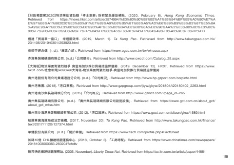 【財政預算案2020】物流業批資助額「杯水車薪」盼有緊急援助補貼. (2020, February 6). Hong Kong Economic Times.Retrieved from https://inews.hket.com/article/2574994/ã財æ¿é ç®æ¡2020ãç©æµæ¥æ¹è³å©é¡ãæ¯æ°´è»èª%2ããç¼æç·æ¥æ´å©è£è²¼倡建「貿易單一窗口」 增通關效率. (2019, March 1). Ta Kung Pao. Retrieved from http://www.takungpao.com.hk/231106/2019/0301/253923.html長榮空運倉儲. (n.d.). 「庫區介紹」. Retrieved from https://www.egac.com.tw/tw/whouse.aspx赤灣集裝箱碼頭有限公司. (n.d.) 「公司簡介」. Retrieved from http://www.cwcct.com/Catalog_25.aspx 【大灣區】物流業面對激烈競爭 冀當局加快推行貿易措施保優勢. (2019, December 12). HK01. Retrieved from https://www.hk01.com/社會新聞/409349/大灣區-物流業面對激烈競爭-冀當局加快推行貿易措施保優勢廣州港股份有限公司黃埔港務分公司. (n.d.). 「公司概況」. Retrieved from http://www.hp.gzport.com/corpinfo.html廣州港集團. (2018). 「港口業務」. Retrieved from http://www.gzpgroup.com/jtyw/gkyw/201804/t20180402_2263.html廣州港南沙集裝箱碼頭分公司. (2015). 「公司概况」. Retrieved from http://www.gznict.com/?page_id=265 廣州集裝箱碼頭有限公司. (n.d.). 「廣州集裝箱碼頭有限公司設施設備」. Retrieved from https://www.gct.com.cn/about_gct/about_gct_mtss.htm廣州南沙海港集裝箱碼頭有限公司. (2012). 「港口設施」. Retrieved from https://www.goct.com.cn/sitecn/gkss/1589.html航運業冀海運局成法定機構. (2017, November 20). Ta Kung Pao. Retrieved from http://www.takungpao.com.hk/finance/text/2017/1120/127374.html華儲股份有限公司 . (n.d.). 「關於華儲」. Retrieved from https://www.tactl.com/profile.php#FactSheet加碼10億 DHL擴建桃園運務中心. (2018, October 3). 「工商時報」. Retrieved from https://www.chinatimes.com/newspapers/20181003000363-260204?chdtv聯邦快遞擴建桃園服務站. (2005, November). Liberty Times Net. Retrieved from https://ec.ltn.com.tw/article/paper/44861115