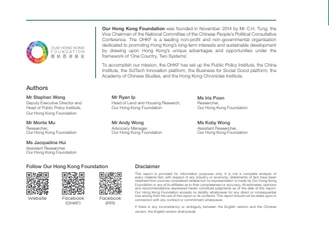 Follow Our Hong Kong Foundation DisclaimerAuthorsOur Hong Kong Foundation was founded in November 2014 by Mr C.H. Tung, the Vice Chairman of the National Committee of the Chinese People’s Political Consultative Conference. The OHKF is a leading non-profit and non-governmental organisation dedicated to promoting Hong Kong’s long-term interests and sustainable development by drawing upon Hong Kong’s unique advantages and opportunities under the framework of ‘One Country, Two Systems’.To accomplish our mission, the OHKF has set up the Public Policy Institute, the China Institute, the SciTech Innovation platform, the Business for Social Good platform, the Academy of Chinese Studies, and the Hong Kong Chronicles Institute.This report is provided for information purposes only. It is not a complete analysis of every material fact with respect of any industry or economy. Statements of fact have been obtained from sources considered reliable but no representation is made by Our Hong Kong Foundation or any of its affiliates as to their completeness or accuracy. All estimates, opinions and recommendations expressed herein constitute judgments as of the date of this report. Our Hong Kong Foundation accepts no liability whatsoever for any direct or consequential loss arising from the use of this report or its contents. This report should not be relied upon in connection with any contract or commitment whatsoever.If there is any inconsistency or ambiguity between the English version and the Chinese version, the English version shall prevail.Website Facebook(OHKF)Facebook(PPI)Mr Stephen WongDeputy Executive Director andHead of Public Policy Institute,Our Hong Kong FoundationMs Iris PoonResearcher, Our Hong Kong FoundationMr Monte MuResearcher, Our Hong Kong FoundationMr Andy WongAdvocacy Manager, Our Hong Kong FoundationMr Ryan Ip Head of Land and Housing Research,Our Hong Kong FoundationMs Koby WongAssistant Researcher, Our Hong Kong FoundationMs Jacqueline HuiAssistant Researcher, Our Hong Kong Foundation