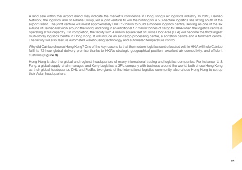 A land sale within the airport island may indicate the market’s confidence in Hong Kong’s air logistics industry. In 2018, Cainiao Network, the logistics arm of Alibaba Group, led a joint venture to win the bidding for a 5.3-hectare logistics site sitting south of the airport island. The joint venture will invest approximately HKD 12 billion to build a modern logistics centre, serving as one of the six e-hubs of Cainiao Network around the world, and bring in an additional 1.7 million tonnes of cargo to HKIA when the logistics centre is operating at full capacity. On completion, the facility with 4 million square feet of Gross Floor Area (GFA) will become the third largest multi-storey logistics centre in Hong Kong. It will include an air-cargo processing centre, a sortation centre and a fulfilment centre. The facility will also feature automated warehousing technology and automated temperature control. Why did Cainiao choose Hong Kong? One of the key reasons is that the modern logistics centre located within HKIA will help Cainiao fulfil its 72-hour global delivery promise thanks to HKIA’s strategic geographical position, excellent air connectivity, and efficient customs (Figure 9).Hong Kong is also the global and regional headquarters of many international trading and logistics companies. For instance, Li & Fung, a global supply chain manager, and Kerry Logistics, a 3PL company with business around the world, both chose Hong Kong as their global headquarter. DHL and FedEx, two giants of the international logistics community, also chose Hong Kong to set up their Asian headquarters.21