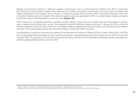 Besides its prominent presence in global air logistics, Hong Kong is also a world-renowned maritime hub. HKP is ranked the 8th among the world’s busiest maritime hubs measured by container throughput. Hong Kong is also the world’s 4th largest ship registry measured by ship tonnage. Like our airport, our seaport is equally well-connected. HKP is ranked 6th among the most wellconnected container ports in the world. 300 container vessel services are generated in HKP on a weekly basis, helping consignors to ship their cargo to 420 destinations around the world (Figure 10).HKP is famous for its operating efficiency. Container vessels calling at Hong Kong can usually make up for the delays in previous stops, making Hong Kong the catch-up port. Port operators’ pursuit for efficiency doesn’t stop there. In January 2019, four of the five terminal operators announced they would form The Seaport Alliance, allowing the sharing of berths and yard area across different terminals. This could possibly reduce inter-terminal trucking by nearly 50% within one year.10Last November, Hong Kong welcomed the opening of the International Chamber of Shipping (China) Liaison Office (ICS). The ICS is the principal global trade association for ship owners and operators, representing all sectors and trades and over 80% of the world’s merchant fleet. The opening of the ICS office proved Hong Kong’s prominence in the international shipping industry, especially as a maritime gateway between China and the world.1110 Wong, C., Ma, H., & Leung, L. (2018). Collaboration at the Hong Kong Port - Benefits from Facility Sharing. 11 International Chamber of Shipping. (2019). Press Release: International Chamber of Shipping opens China Liaison Office in Hong Kong.23