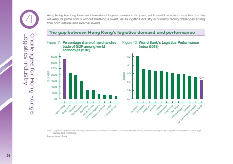 4Logistics Industry Challenges for Hong Kong’s Figure 11. Percentage share of merchandisetrade of GDP among worldeconomies (2018)Figure 12. World Bank's Logistics PerformanceIndex (2018)% of GDP0P00 0%00050%Hong KongSingaporeVietnamNetherlandsGermanySouth KoreaUnited KingdomMainland ChinaUnited StatesIndiaSource: World BankLogistics Performance Index by World Bank considers six factors: Customs, Infrastructure, International shipments, Logistics competence, Tracking &tracing, and Timeliness.Note:12thScore3.73.83.94.04.14.2 GermanySwedenBelgiumAustriaJapanNetherlandsSingaporeUnited KingdomHong KongFinlandUnited Arab EmiratesDenmarkHong Kong has long been an international logistics centre in the past, but it would be naive to say that the city will keep its prime status without breaking a sweat, as its logistics industry is currently facing challenges arising from both internal and external events.The gap between Hong Kong’s logistics demand and performance24
