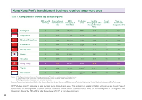 %<5'P%<20q%N/A59C,30337,19627,53525,76923,22321,99221,01018,30317,30014,811835[1]8589681,167873707450344[2]13,100[3]8,114[3]19.323.135.245.337.632.121.418.8757.2547.8ShanghaiSingaporeNingbo-ZhoushanShenzhenGuangzhouBusanQingdaoHong KongTianjinRotterdam4372614774412573253919.411.915.824.811.717.3184.75242082019throughput(’000 TEU)2019 worldrankingInternationaltranshipmentrateYard-tothroughput ratio(ha per 1 millionTEU)No. ofberthsPort size(ha)Yard-toberth ratio(ha per berth)HKP’s future growth potential is also curbed by its limited yard area. The problem of space limitation will worsen as the city’s port relies more on transhipment business and as traditional direct export business relies more on mainland ports in Guangzhou and Shenzhen. Currently, 71% of the total throughput of HKP is from transhipment. Hong Kong Port’s transhipment business requires larger yard area28