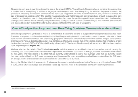 While Hong Kong Port’s yard area at KTCTs is rather limited, the demand for land to support the transhipment business has risen. Therefore, a large amount of non-terminal land in the Kwai Tsing area is planned for port back-up uses. However, quite a lot of these back-up sites are not well utilised. Our proprietary geographic information system analysis based on satellite images, aerial photos, Outline Zoning Plans, a digital land boundary map (ic1000), and field visits showed that of the 59 sites, totalling 122.6 hectares of port back-up land around KTCTs, 42.4% is not efficiently utilised, with 7.7 hectares of land currently left vacant and 44.3 hectares used as open air parking sites (Figure 16). We have attached the details of the 59 sites in Appendix, with the years of under-utilisation (vacant or used as open air parking, by observing past aerial photos taken by the Lands Department) recorded for each site. On average, the sites have been under-utilised for 13.5 years. The track record of the sites that are currently under-utilised is poorer than average. Sites that are currently vacant had been under-utilised for 16.8 years on average, and those used for open air parking now had been under-utilised for 21.9 years on average. Some of these sites have even been under-utilised for 20 to 30 years.Among the 59 sites listed in the appendix, 17 sites were discussed in a study conducted by the Transport and Housing Bureau (THB) in 2015, with a future land usage plan proposed (Table 2). However, most of the proposals still haven’t been implemented.Over 40% of port back-up land near Kwai Tsing Container Terminals is under-utilisedSingapore’s port area is over three times the size of the area of KTCTs. Thus although Singapore has a container throughput that is double that of Hong Kong, it still has a larger yard-to-throughput ratio than Hong Kong. In addition, Singapore is now in the process of relocating its container terminals to the new Tuas Mega Port on some 1,400 hectares of land, which is 1.6 times the size of Singapore’s existing ports.12 The satellite images also showed that Singapore’s port area is large enough to support its port operation, so there is no need to designate additional back-up land near the yard to support the port operations. Also, the boundary of Singapore’s terminal area is relatively straight and clean, leaving no sites in corners or under bridges. The sufficient yard area and well-planned boundary explain the better overall utilisation of land in the port area of Singapore.12 JLL. (2018). Singapore’s west beckons.30