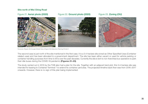 Sources: (Figure 22) Google Street View; (Figure 23) Statutory Panning Portal 2 Figure 21. Aerial photo (2020) Figure 22. Ground photo (2020) Figure 23. Zoning (OU)The second case is just north of the site mentioned in the first case. It is a 5.4-hectare site zoned as Other Specified Uses (Container related uses) and has been allocated to a government department. The site has been either vacant or used for vehicle parking or container handling purposes from time to time over the past decades. Currently the site is lent to non-franchise bus operators to park their idle buses during the COVID-19 pandemic (Figures 21–23).The study carried out in 2015 by the THB also had a plan for the site. Together with an adjacent land plot, this 5.4-hectare site was intended for leasing to Container Terminal 7 to extend its container yard area. The projected timeline back then was from 2016–2017 onwards. However, there is no sign of this plan being implemented.Site north of Mei Ching Road35