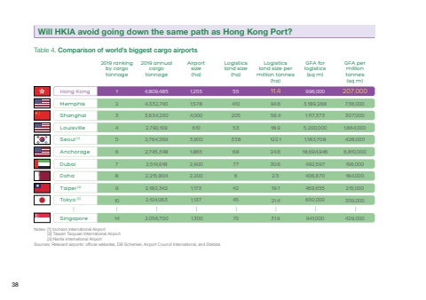 2019 rankingby cargotonnage2019 annualcargotonnageLogisticsland size permillion tonnes(ha)Airportsize(ha)GFA forlogistics(sq m)Logisticsland size(ha)GFA permilliontonnes(sq m)Table 4. Comparison of world’s biggest cargo airports [1] Incheon International Airport[2] Taiwan Taoyuan International Airport[3] Narita International AirportSources: Relevant airports’ official websites, DB Schenker, Airport Council International, and StatistaNotes:12345678910144,809,4854,332,7403,634,2302,790,1092,764,3692,745,3482,514,9182,215,8042,182,3422,104,0632,056,7001,2551,5784,0006103,9001,8652,9002,2001,1731,137 1,30055410205533386877642457011.494.656.418.9122.124.630.62.519.121.431.9207,000736,000307,0001,864,000428,0006,810,000196,000184,000215,000309,000429,000996,0003,189,2681,117,3735,200,0001,183,70818,694,946492,597406,670469,655650,000941,000Hong KongMemphisShanghaiLouisvilleSeoul [1]AnchorageDubaiDohaTaipei [2]Tokyo [3]SingaporeWill HKIA avoid going down the same path as Hong Kong Port?38