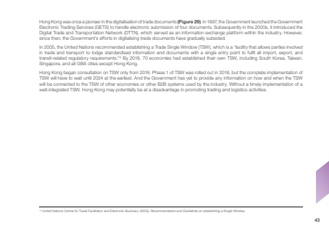 13 United Nations Centre for Trade Facilitation and Electronic Business. (2005). Recommendation and Guidelines on establishing a Single Window.Hong Kong was once a pioneer in the digitalisation of trade documents (Figure 29). In 1997, the Government launched the Government Electronic Trading Services (GETS) to handle electronic submission of four documents. Subsequently in the 2000s, it introduced the Digital Trade and Transportation Network (DTTN), which served as an information exchange platform within the industry. However, since then, the Government’s efforts in digitalising trade documents have gradually subsided.In 2005, the United Nations recommended establishing a Trade Single Window (TSW), which is a ‘facility that allows parties involved in trade and transport to lodge standardised information and documents with a single entry point to fulfil all import, export, and transit-related regulatory requirements.’13 By 2018, 70 economies had established their own TSW, including South Korea, Taiwan, Singapore, and all GBA cities except Hong Kong.Hong Kong began consultation on TSW only from 2016. Phase 1 of TSW was rolled out in 2018, but the complete implementation of TSW will have to wait until 2024 at the earliest. And the Government has yet to provide any information on how and when the TSW will be connected to the TSW of other economies or other B2B systems used by the industry. Without a timely implementation of a well-integrated TSW, Hong Kong may potentially be at a disadvantage in promoting trading and logistics activities.43