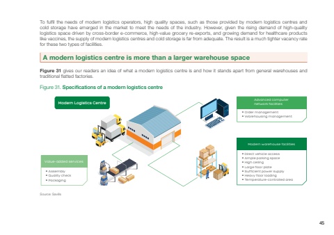 Source: SavillsFigure 31. Specifications of a modern logistics centreModern Logistics Centre• Assembly• Quality check• PackagingValue-added services• Order management• Warehousing managementAdvanced computer network facilities• Direct vehicle access• Ample parking space• High ceiling• Large floor plate• Sufficient power supply• Heavy floor loading• Temperature-controlled areaModern warehouse facilitiesTo fulfil the needs of modern logistics operators, high quality spaces, such as those provided by modern logistics centres and cold storage have emerged in the market to meet the needs of the industry. However, given the rising demand of high-quality logistics space driven by cross-border e-commerce, high-value grocery re-exports, and growing demand for healthcare products like vaccines, the supply of modern logistics centres and cold storage is far from adequate. The result is a much tighter vacancy rate for these two types of facilities.Figure 31 gives our readers an idea of what a modern logistics centre is and how it stands apart from general warehouses and traditional flatted factories.A modern logistics centre is more than a larger warehouse space45