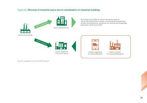 Sources: Legislative Council and CBRE ResearchFigure 35. Removal of industrial space due to revitalisation of industrial buildingsUrban logistics/Industrial space18 million sq ft (8% of total industrial space) were removed from stock of industrial propertiesunder revitalisation scheme for industrial buildingsbetween 2010 and 2018Office/Retail/HotelAlternative?RevitalisationIndustrial buildingUrban logistics re-centralisationPolicy-driven re-industrialisation51