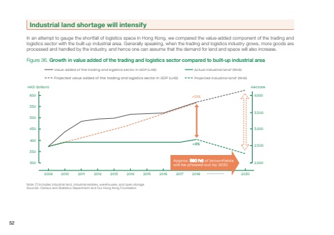 +8%+51%Note: [*] Includes industrial land, industrial estates, warehouses, and open storage.Sources: Census and Statistics Department and Our Hong Kong FoundationFigure 36. Growth in value added of the trading and logistics sector compared to built-up industrial areaProjected value added of the trading and logistics sector in GDP (LHS)Value added of the trading and logistics sector in GDP (LHS) Actual industrial land* (RHS)Projected industrial land* (RHS)2009 2010 2011 2012 2013 2014 2015 2016 2017 2018 2030Approx. 390 ha of brownfieldswill be phased out by 2030 300350400450500550600HKD (billion) Hectare4,0003,5003,0002,5002,000In an attempt to gauge the shortfall of logistics space in Hong Kong, we compared the value-added component of the trading and logistics sector with the built-up industrial area. Generally speaking, when the trading and logistics industry grows, more goods are processed and handled by the industry, and hence one can assume that the demand for land and space will also increase.Industrial land shortage will intensify52