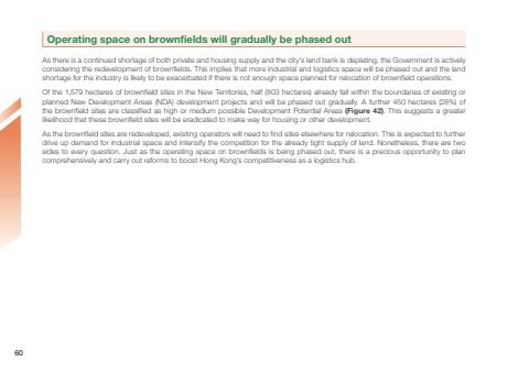 As there is a continued shortage of both private and housing supply and the city’s land bank is depleting, the Government is actively considering the redevelopment of brownfields. This implies that more industrial and logistics space will be phased out and the land shortage for the industry is likely to be exacerbated if there is not enough space planned for relocation of brownfield operations. Of the 1,579 hectares of brownfield sites in the New Territories, half (803 hectares) already fall within the boundaries of existing or planned New Development Areas (NDA) development projects and will be phased out gradually. A further 450 hectares (28%) of the brownfield sites are classified as high or medium possible Development Potential Areas (Figure 42). This suggests a greater likelihood that these brownfield sites will be eradicated to make way for housing or other development.As the brownfield sites are redeveloped, existing operators will need to find sites elsewhere for relocation. This is expected to further drive up demand for industrial space and intensify the competition for the already tight supply of land. Nonetheless, there are two sides to every question. Just as the operating space on brownfields is being phased out, there is a precious opportunity to plan comprehensively and carry out reforms to boost Hong Kong’s competitiveness as a logistics hub.Operating space on brownfields will gradually be phased out60